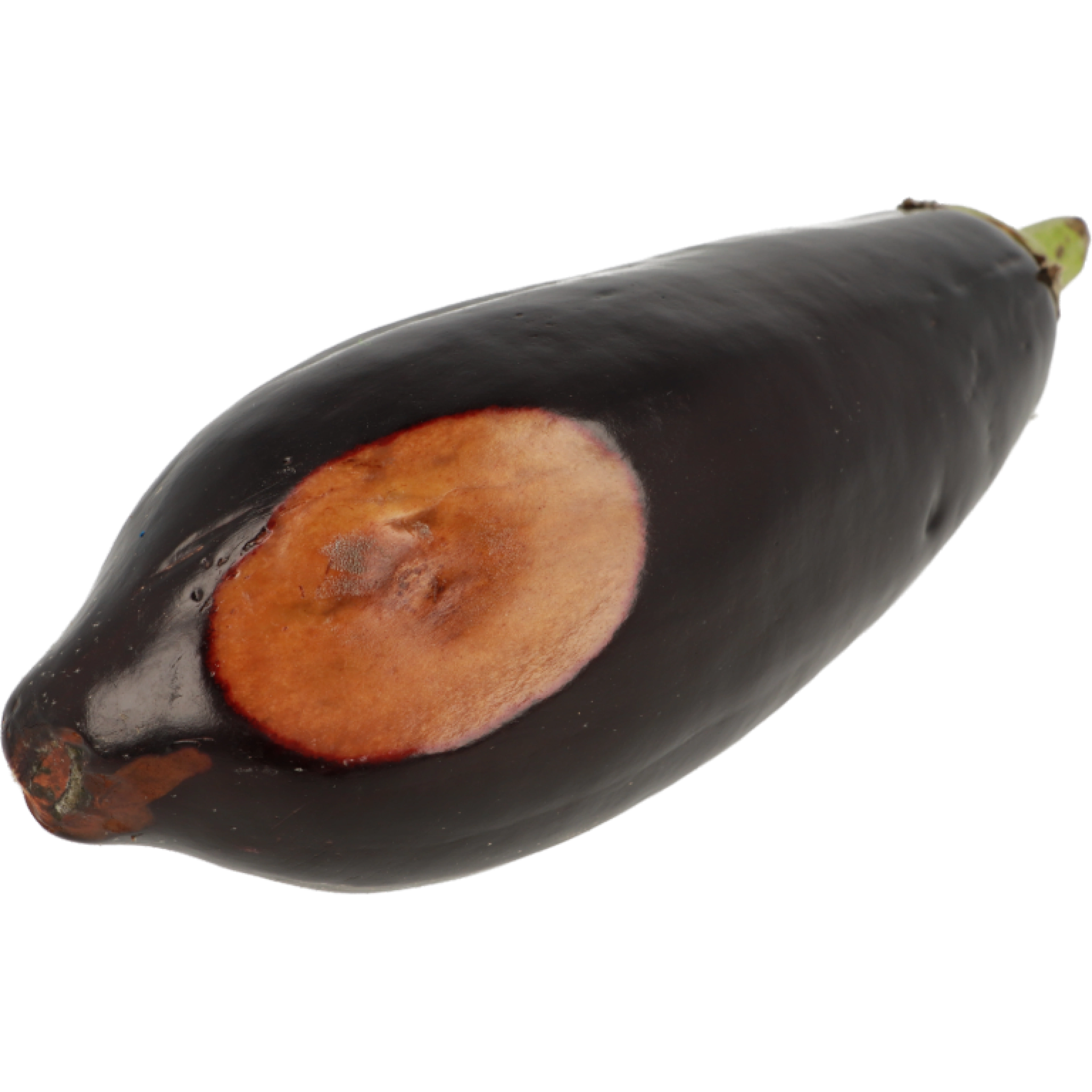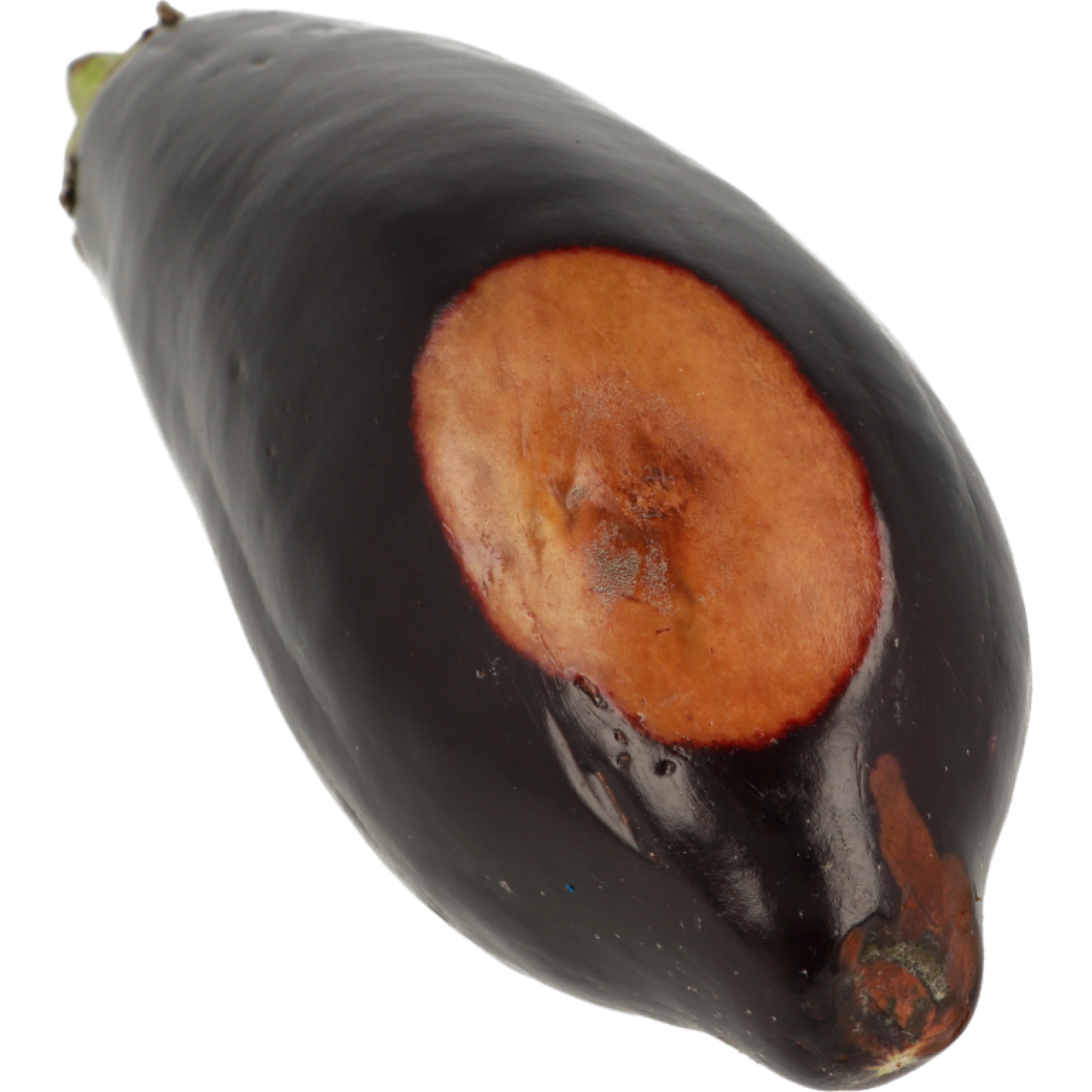 Aubergines verkleuren lichter als ze rijper worden. Ze kleuren bruinachtig, vruchtvlees verhard en de zaden worden duidelijk zichtbaar